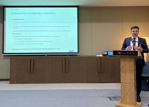 U radnom delu konferencije, Tomašić je govorio o ulozi javnih beležnika u nemačkom kompanijskom pravu, sa posebnim osvrtom na elektronsku komunikaciju sa privrednim registracionim sudovima i mogućnostima za autentifikaciju na daljinu.