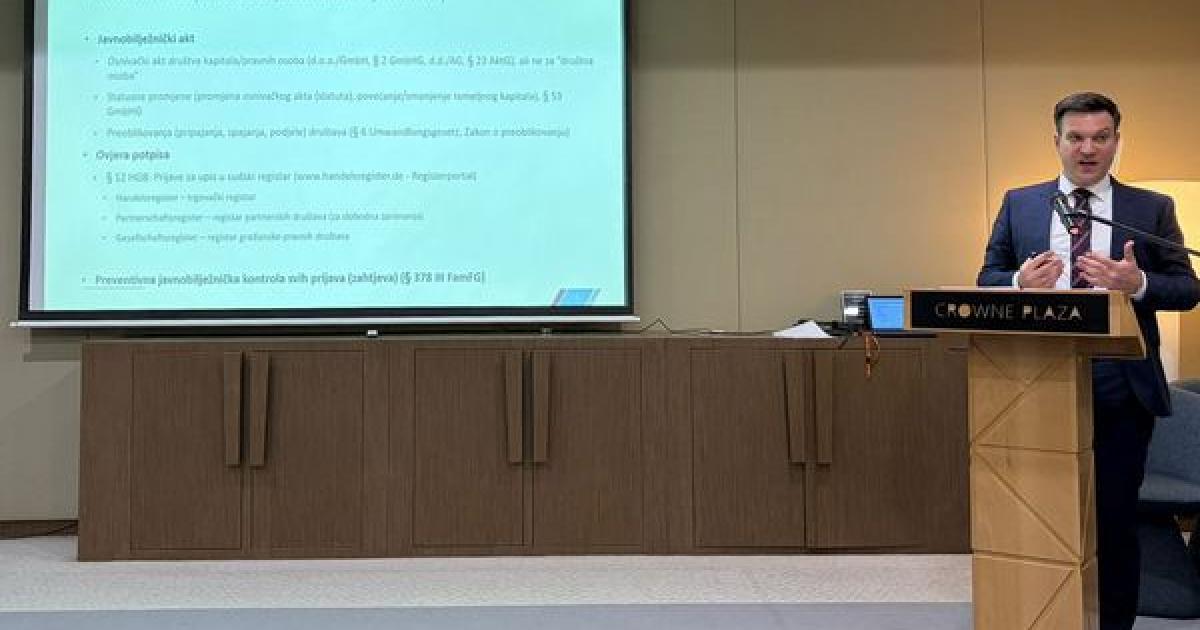 U radnom delu konferencije, Tomašić je govorio o ulozi javnih beležnika u nemačkom kompanijskom pravu, sa posebnim osvrtom na elektronsku komunikaciju sa privrednim registracionim sudovima i mogućnostima za autentifikaciju na daljinu.